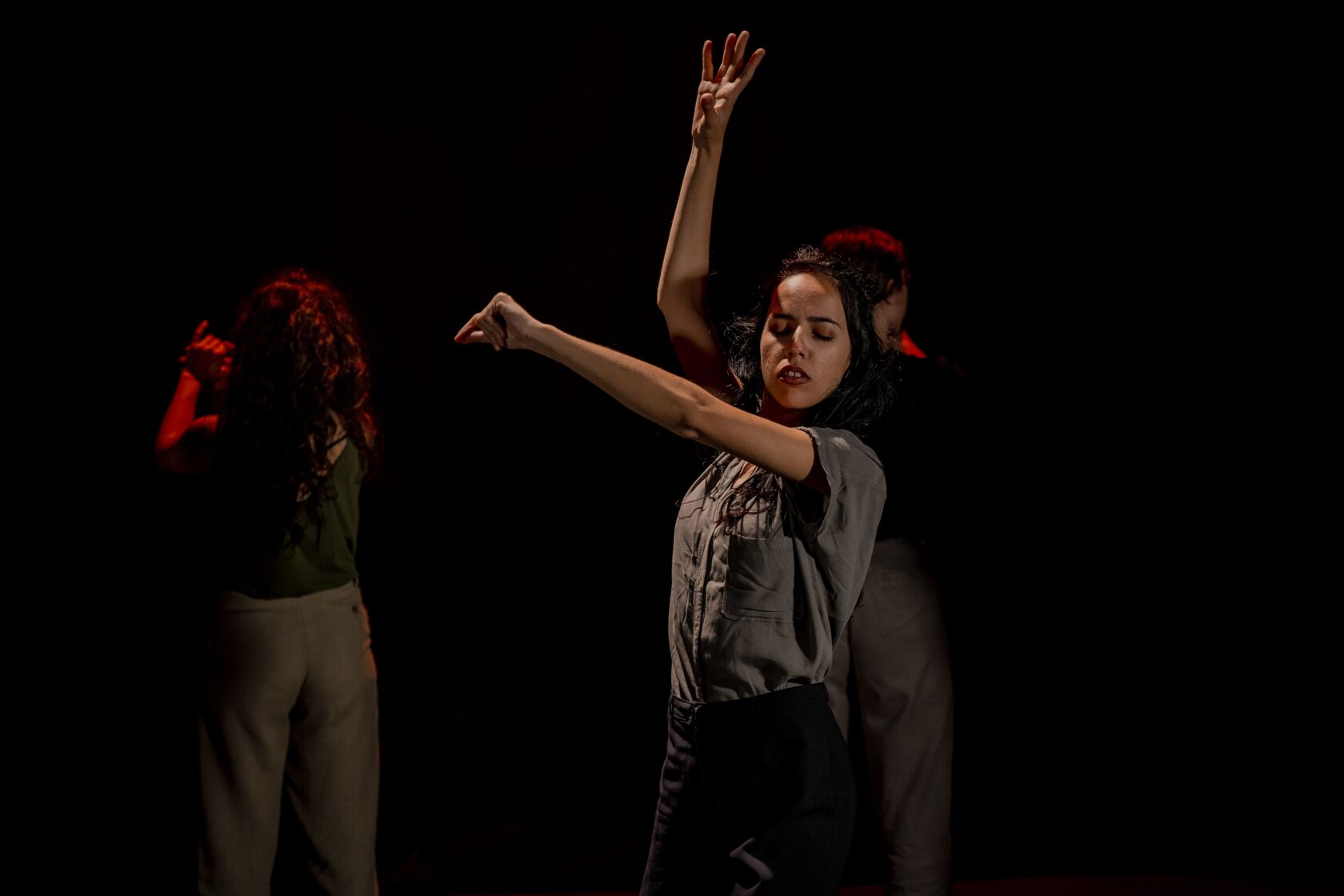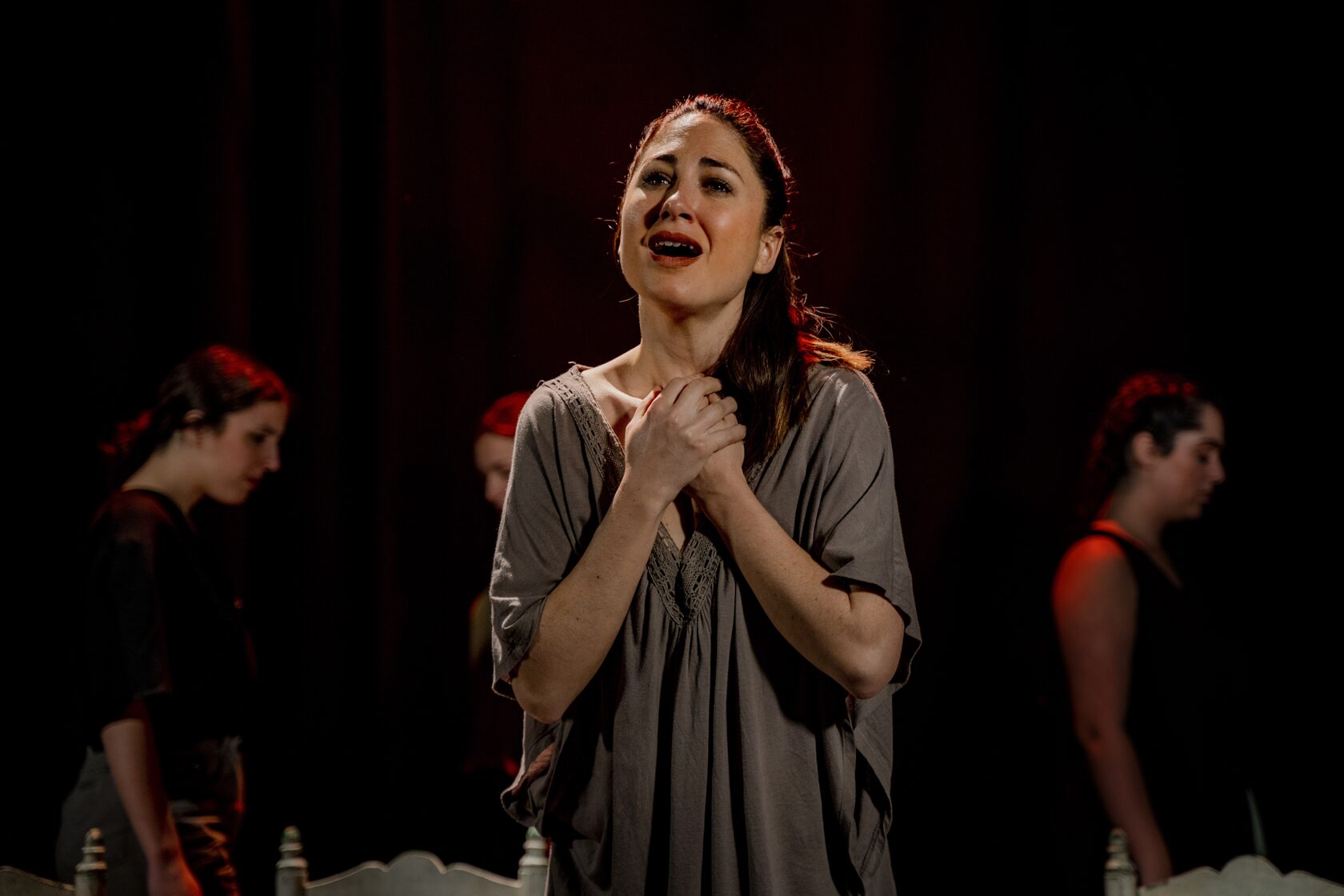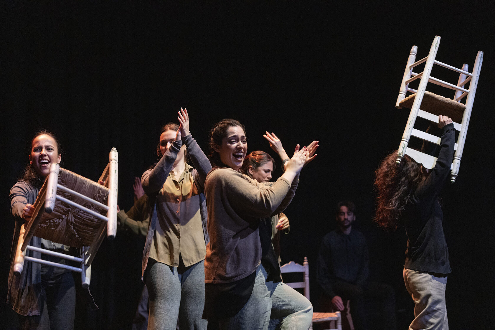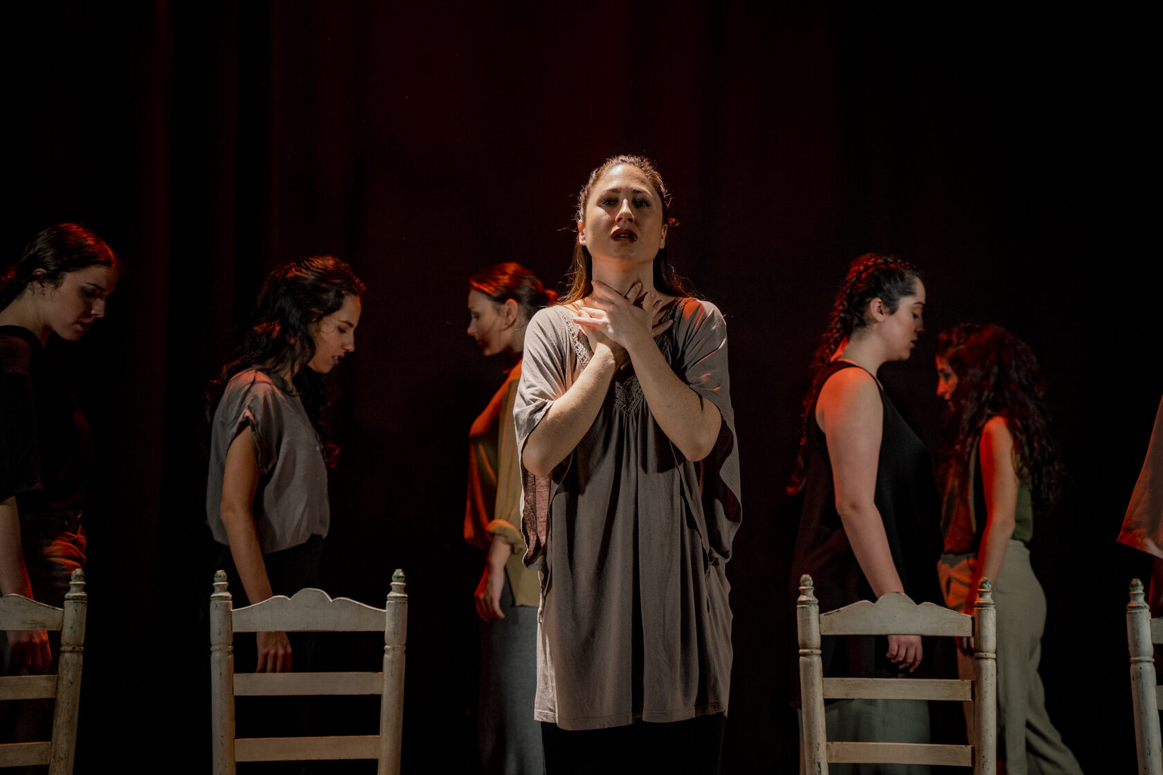 Enlorquecidas hace un recorrido desde una energía sombría, llena de colores oscuros, hasta la aparición de colores vivos, como símbolo de libertad. Bernarda Alba ya dijo “Ojalá tardéis muchos años en pasar el arco de mi casa” y Julieta en El Público “No he tropezado con una amiga en todo el tiempo, a pesar de haber cruzado más de tres mil arcos vacíos”. Esta obra invita, precisamente, a un viaje a través del “arco”. Un arco que nos llama hacia el cambio. Un camino que se muestra a través de las mujeres y sus ropas, y de sillas en movimiento, que forman parte de ese mundo sin luz. Elementos que ayudan a estas mujeres atemporales en su transformación a lo largo de la obra. Todo ello acompañado en directo por el flamenco con música en vivo.